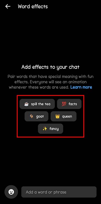 Now, every time you or the other person in the chat types the word or phrase you’ve selected, they will have effects. Both of you will see the emoji you’ve picked appear over the entire screen. Anyone in the chat can use, add, or delete these word effects.