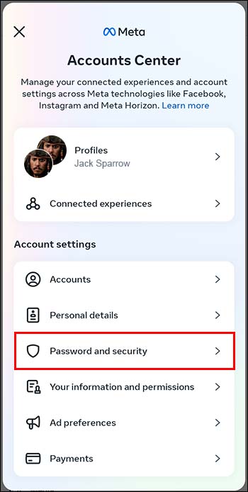 - Next, find the “Accounts Center” option and then locate “Password and Security.” Tap on it to proceed.