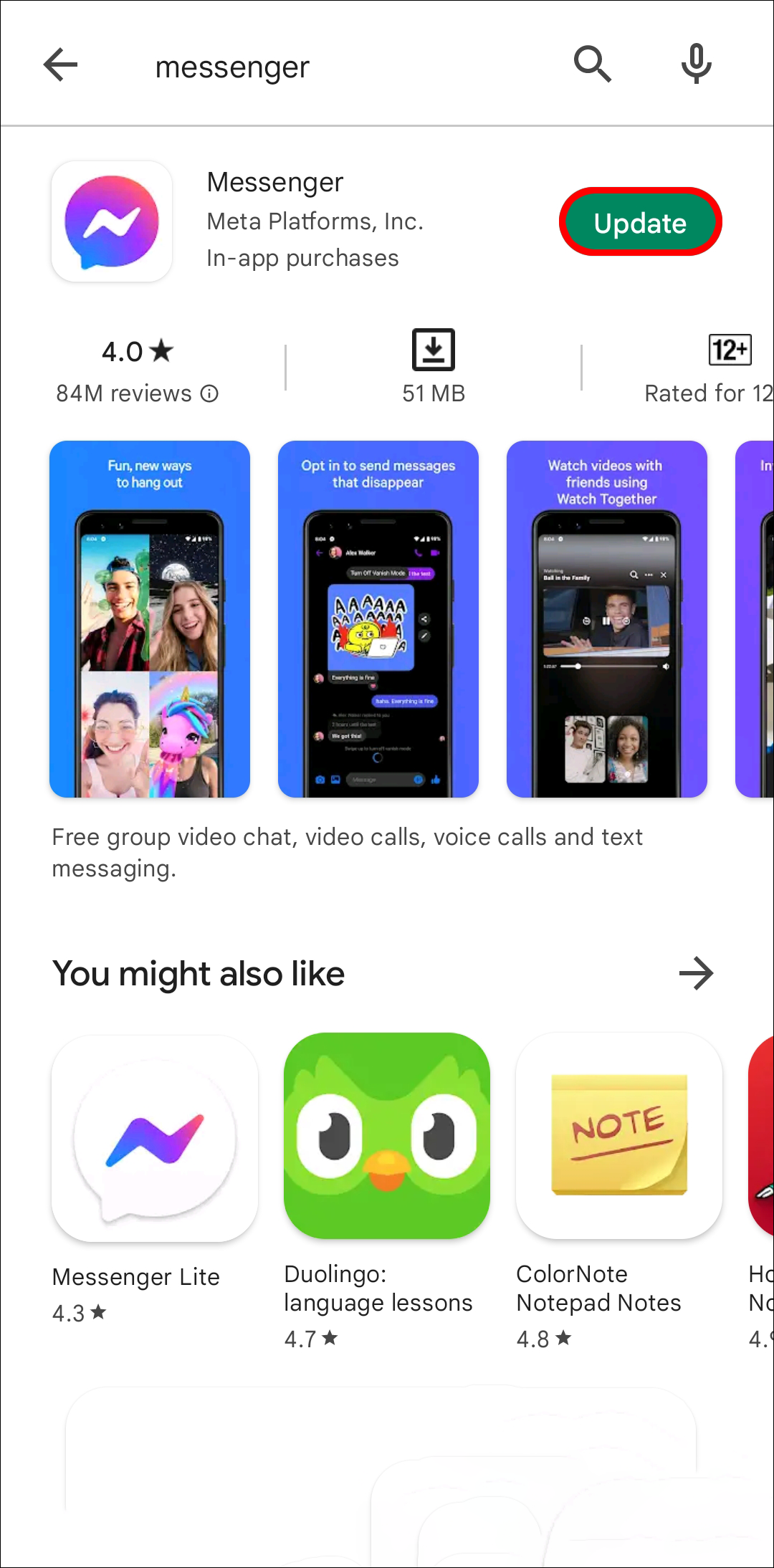 - Go to the Google Play Store and find the Messenger app using the search bar.