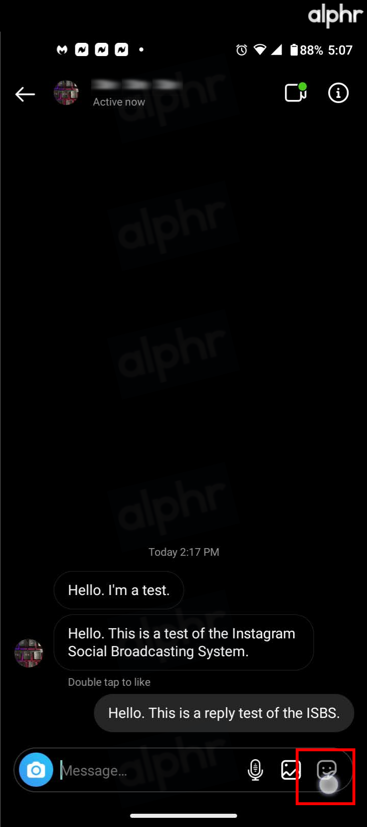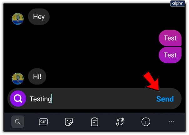 - To add an animated sticker or GIF, tap the sticker icon (peeled square with a smiley face) on the right before you type your message or the same icon on the left after typing your message.