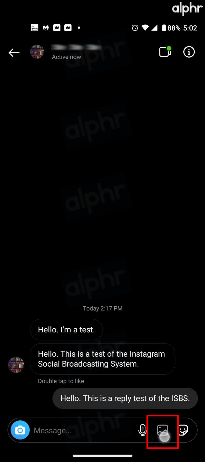 - To add an image from your device’s gallery, tap the image icon (square with mountains and the sun) on the right before you type the message, or the option disappears.