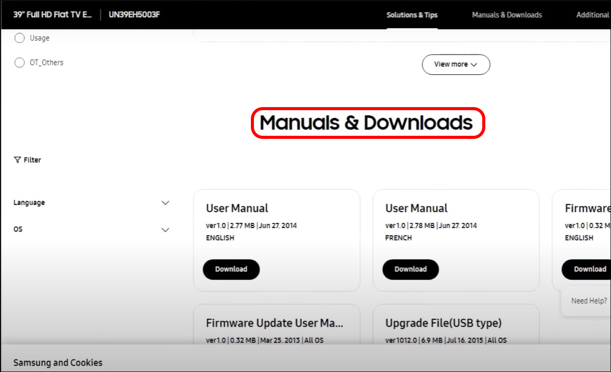 - Look for the Upgrade File(USB type) option and click the Download button next to it. This will download the TV’s firmware update file to your computer.