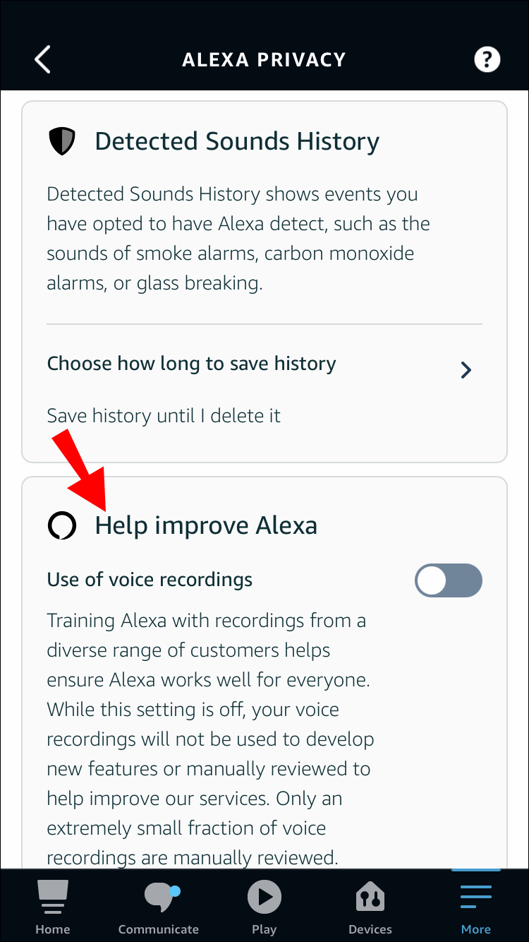 - Go back and scroll down to the “Help Improve Alexa” section.