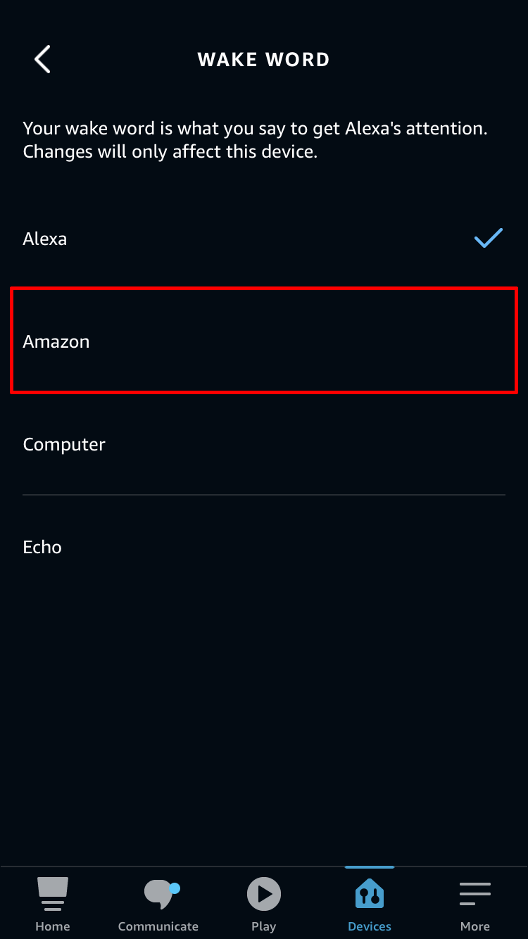 - Tap “Amazon” to set it up as the new wake word.