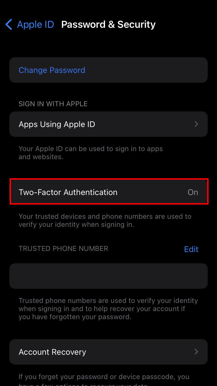 - Press “Password & Security” and check that two-factor authentication has been turned on.