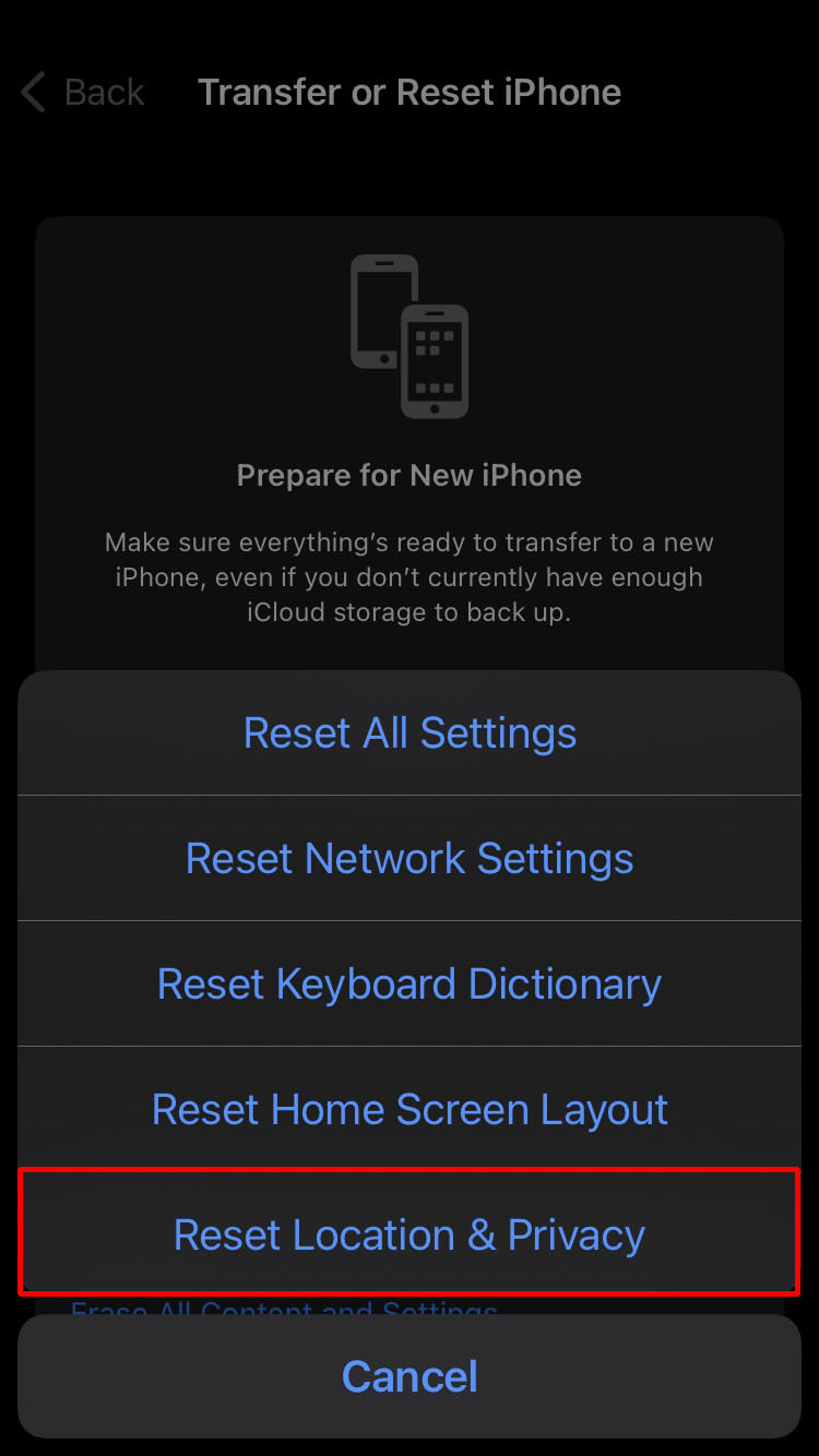 - Select “Reset,” then tap “Reset Location & Privacy.”