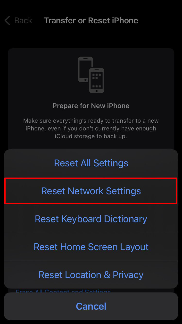 - Navigate to “Reset” and tap “Reset Network Settings.”