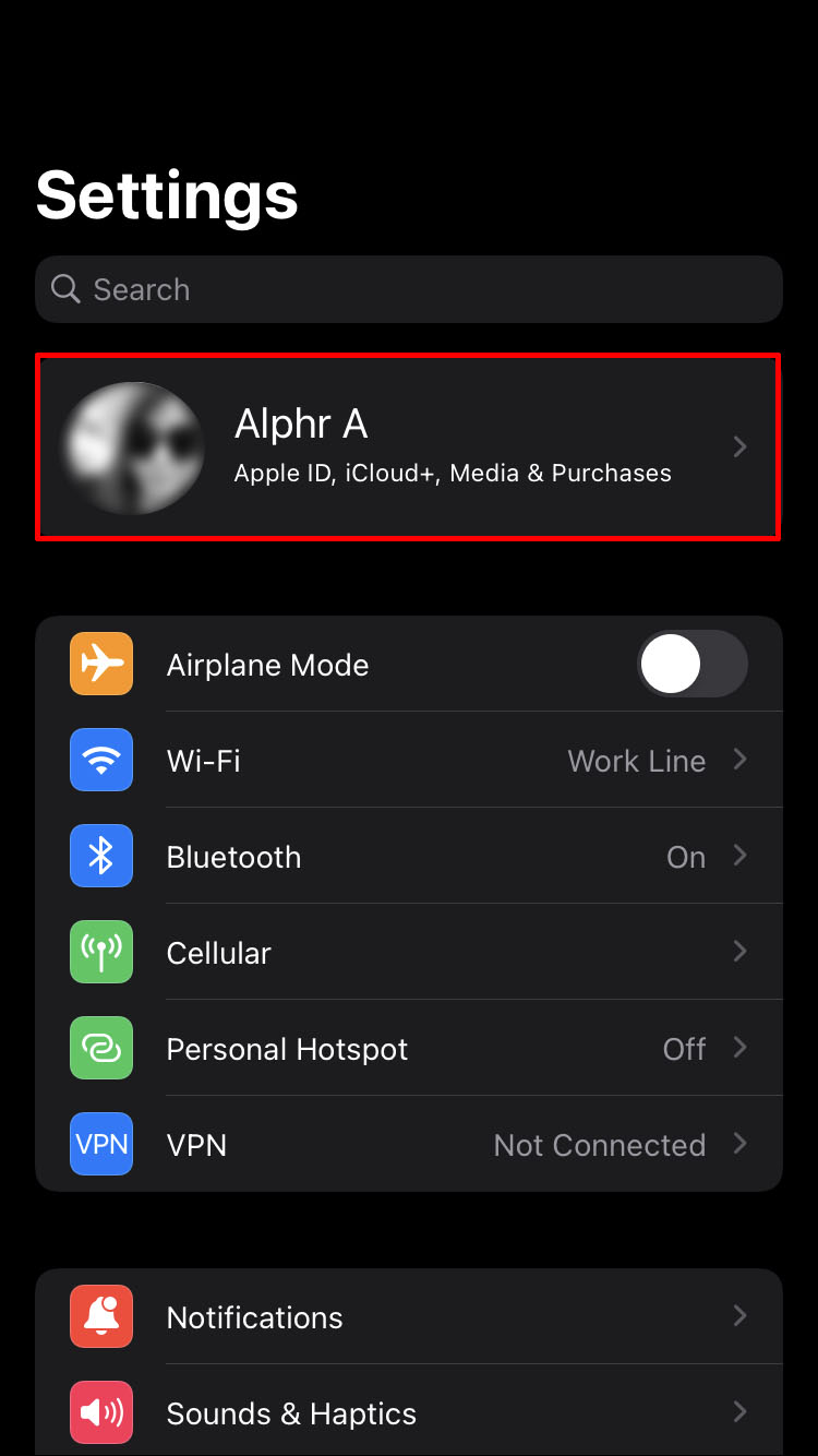 - Open “Settings,” then click on your name to open the Apple ID and iCloud segment.