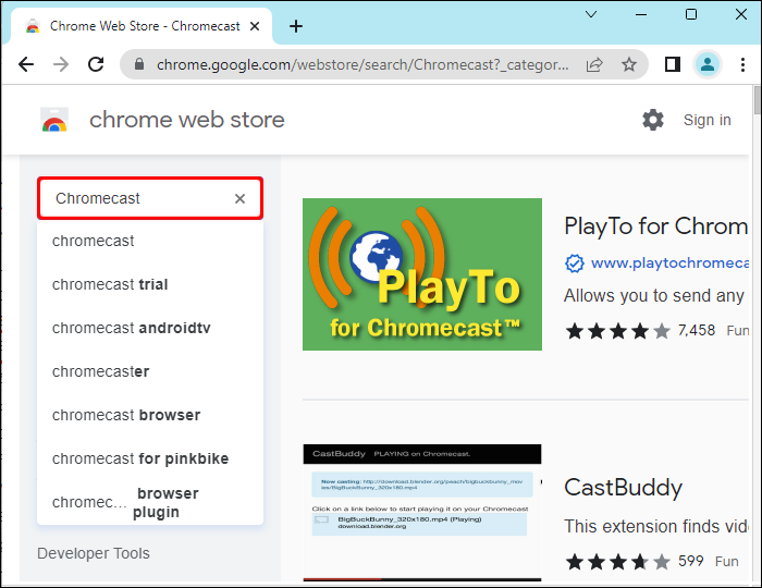 - The Google Chrome web store will appear, search for Chromecast, and select Google Cast.