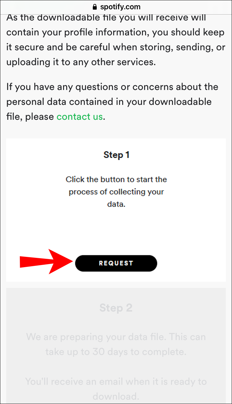 Now, you’ll land on a page where Spotify notifies you that you’ll receive your data in 30 days. In truth, you’ll probably receive your data in less time. Check your email inbox daily. You should receive an email with the link to your data.