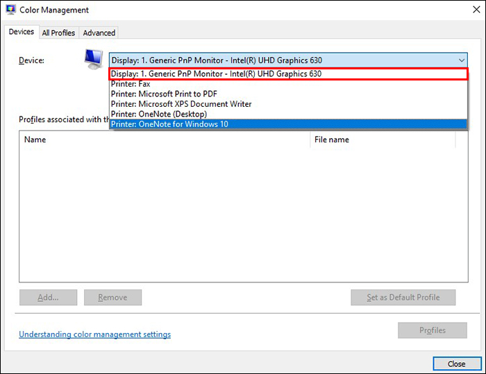 - Select the monitor under the device and repeat the process. Select the same profile and go to the advanced tab.