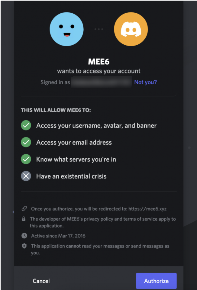- Once logged into Discord, you’ll receive the Mee6 authorization pop-up window asking for access. Click the “Authorize” button at the bottom right of the window.