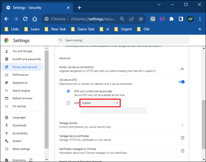 - Locate the “Use Secure DNS” section under the “Advanced” tab.