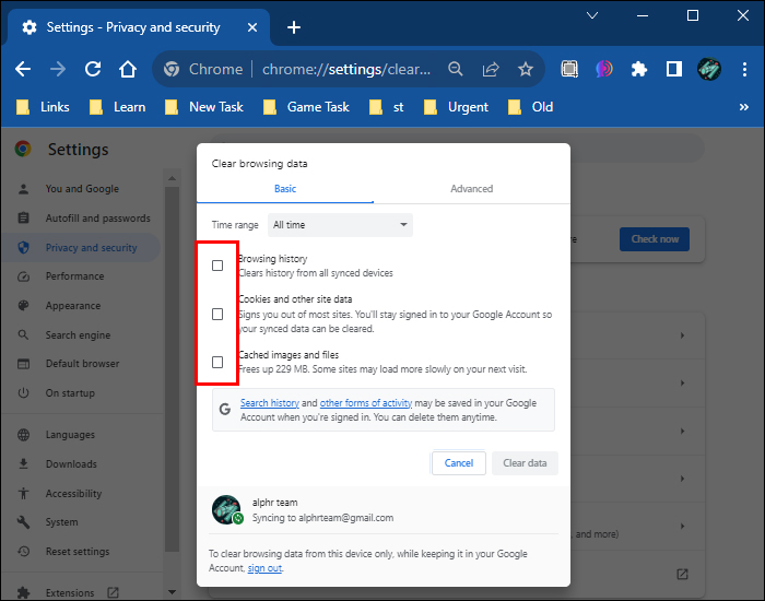- Check the boxes next to “Cookies and other site data” and “Cached images and files.”