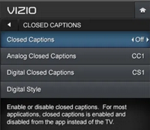 - Choose Closed Captions again and use the left and right rockers on the remote to toggle subtitles on and off. Vizio also offers Analog and Digital Closed Captions—more often than not, you don’t need to change anything here.
