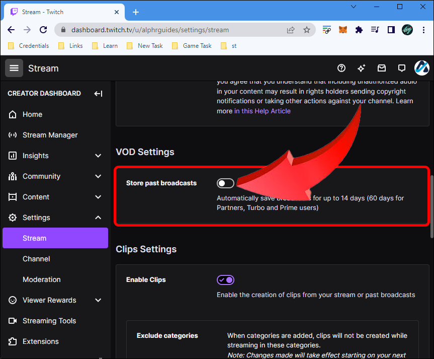 - Locate “VOD Settings” and toggle “Store Past Broadcasts” on.