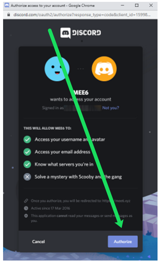 2. The MEE6 site will open a tab in a new window. You’ll get the summary of permission requests that the bot needs to work correctly there. Check if you’re logged in to the account you want to add the bot to and go over the permissions.