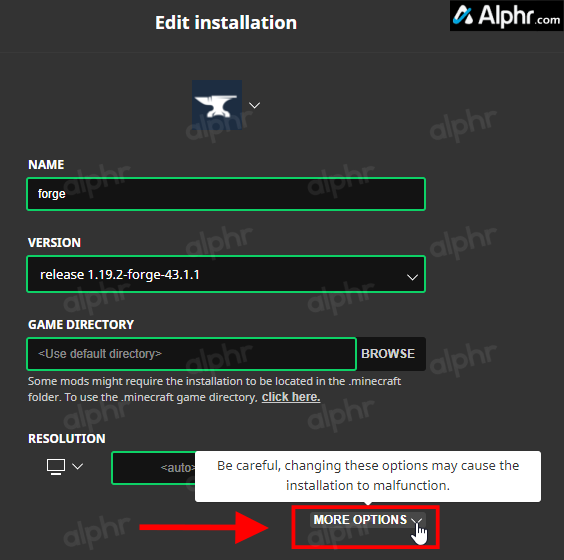 - Select “More Options” in the “Edit Installation” window.