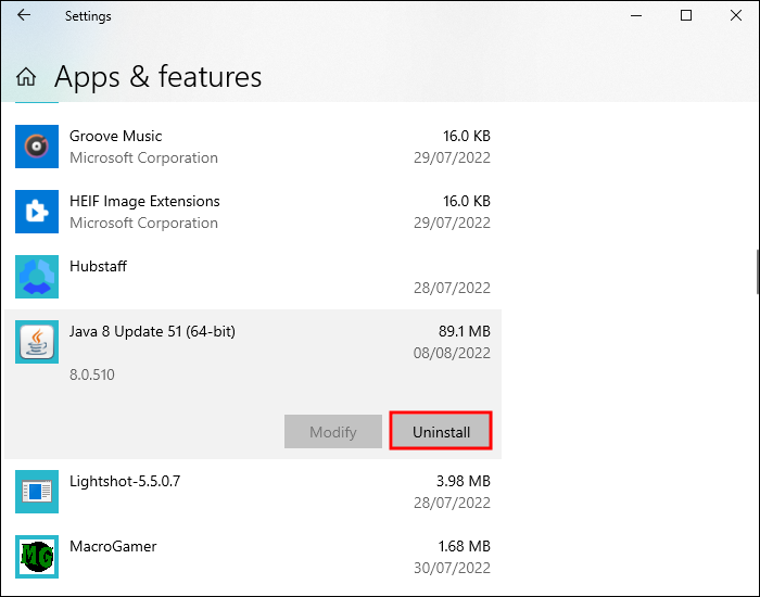 - Click on the “Java” app, then choose “Uninstall.”