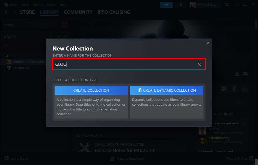 - Enter a name for your collection in the Steam prompt.