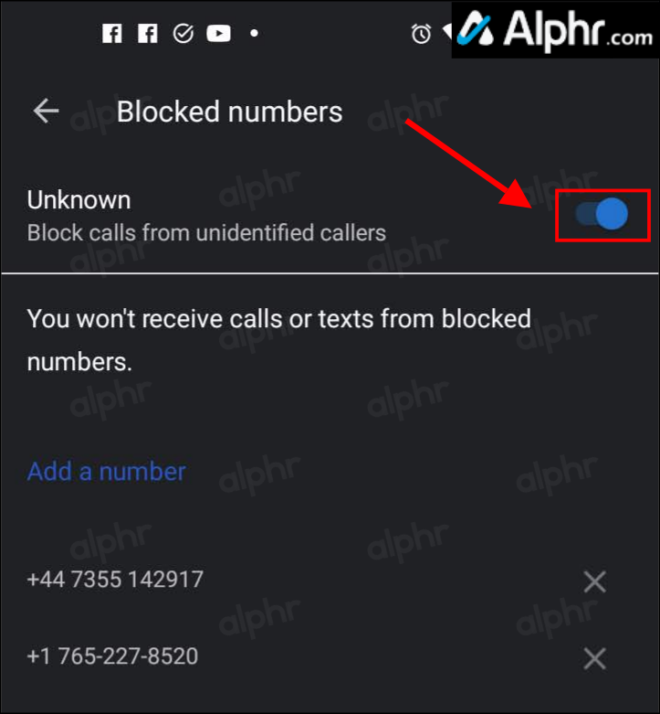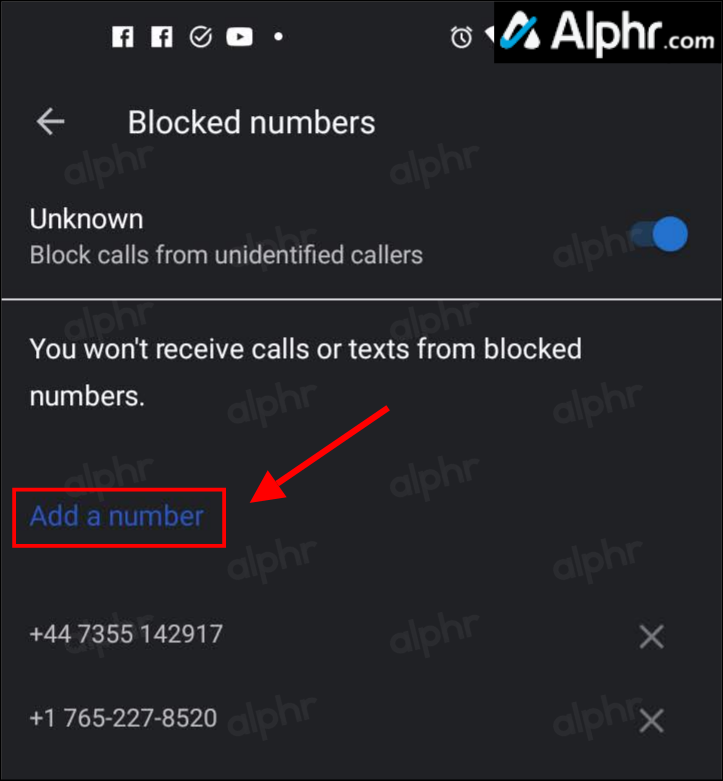 - Tap “Add a number” if you know the number and want to block calls from it specifically, aside from unknown ones.