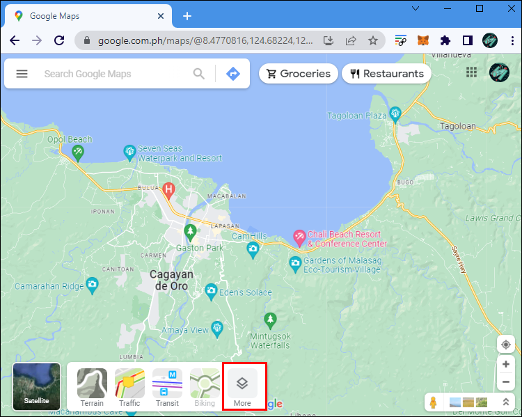 Note: The “Labels” checkbox will be grayed out and uncheckable if you use the “Default” view. Select “Satellite” to activate the “Labels” option.