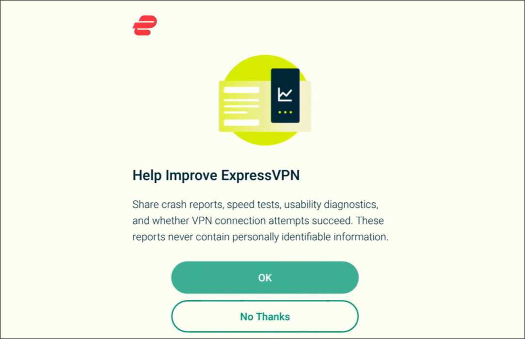 - If you’d like to share your information to help ExpressVPN improve its services, click “OK.”