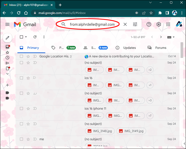 - Type in “from:” and the “email address” you don’t want to go to spam in the search bar at the top of the screen. You can also add the “user’s domain name.”
