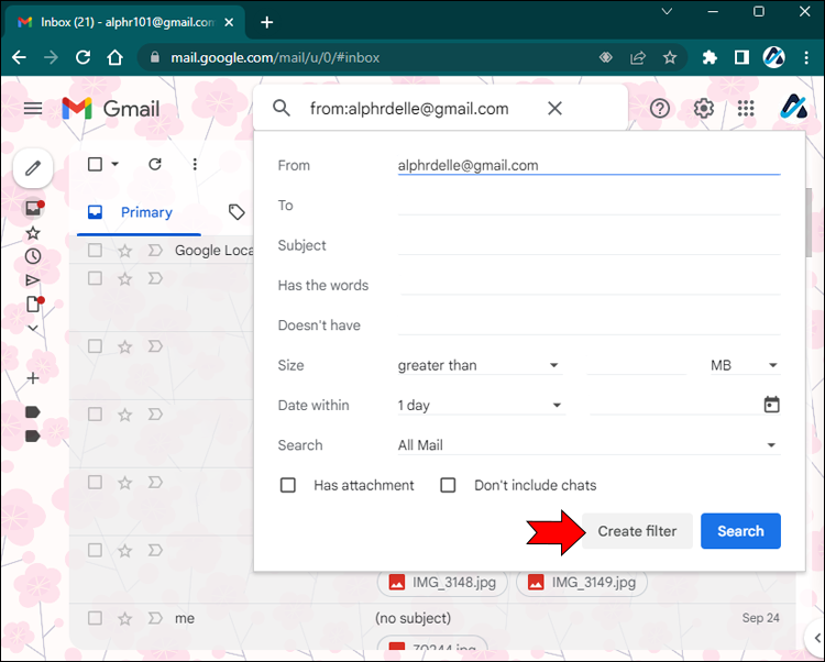 The first method involves creating a custom filter. However, you must do this for one email address at a time. More specifically, if Gmail keeps sending emails from one user to spam, you can ensure this doesn’t happen again. Follow the steps below to see how it’s done: