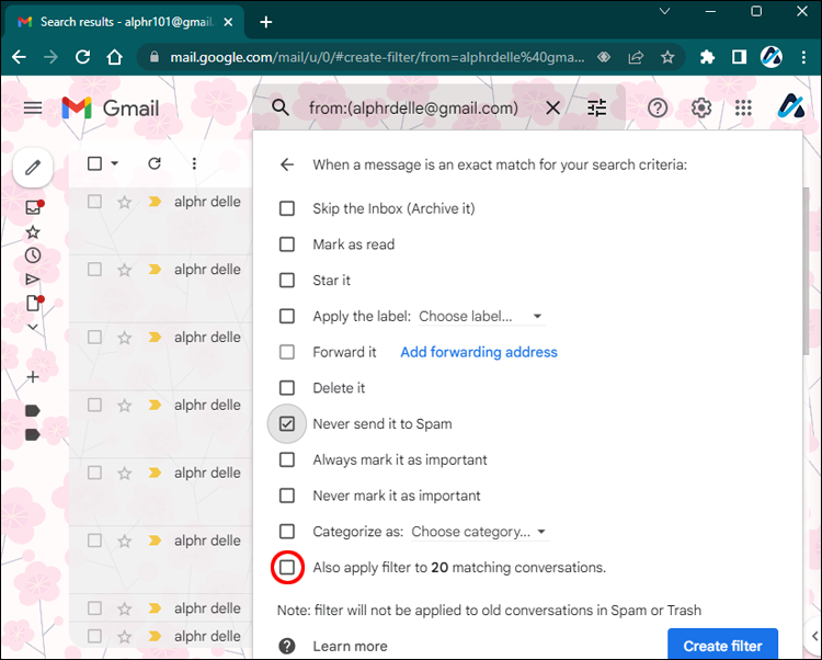 - Click the “Never send to spam” and “Also apply filter to matching conversations” boxes.