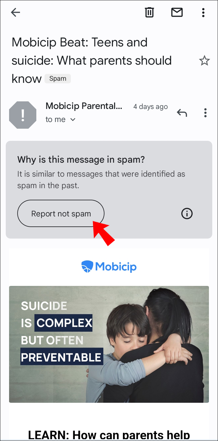 That’s all there is to it. The next time you receive a mail from this email address, it won’t go to spam anymore. On some phones, you might have to tap on the email and then go to the three dots in the upper-right corner. The “Report not spam” option will be there.