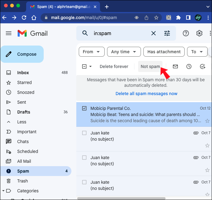 Additionally, you can click on that email and select the “Report not spam” option. Once you do this, any future mail from this email address won’t go to spam again.