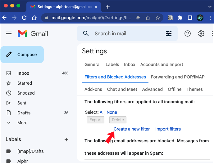 - Choose the “Filters and Blocked Addresses” tab at the top of the screen.