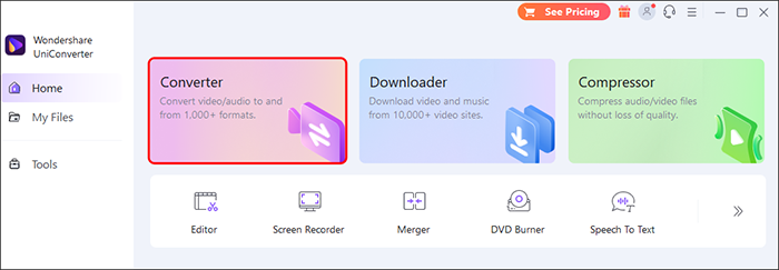 - Visit the Wondershare website, locate Uniconverter, and download it on your PC. After installing it, open it and choose “Converter” under the “Home” button.