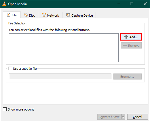 - A new window with several tabs will appear. Move under the “File” tab and hit “Add.” Then, choose the mp4 video file you wish to convert to mp3.