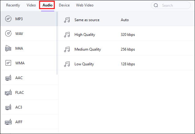 - Click “Audio” and choose “MP3” as your preferred output format.