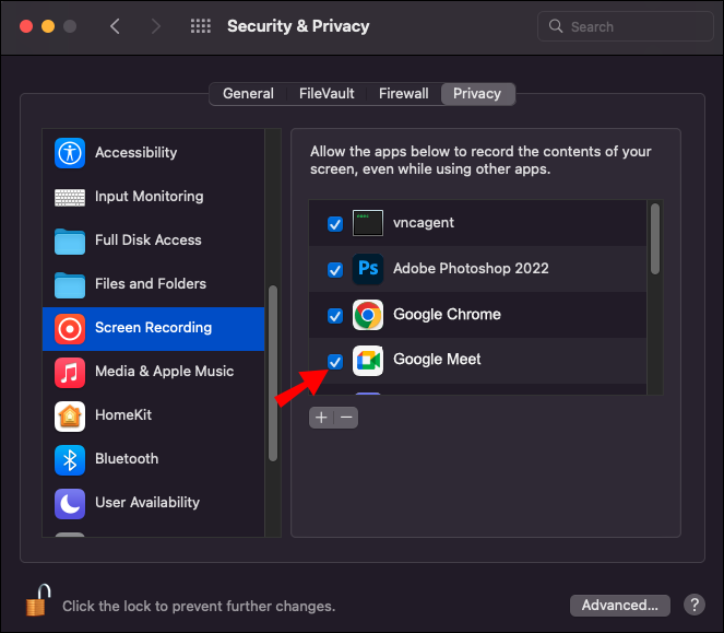 - Launch the “Privacy” tab and choose “Screen Recording.”