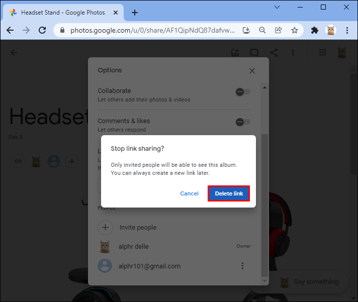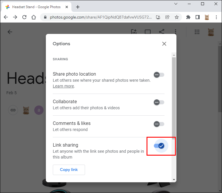 If you still want to share the photo but not with everyone who has the link, you can always reset it. To do this, turn link sharing off and then back on again. Google will have generated a new link for your album. Bear in mind that if you remove someone from the album but still have “link sharing” turned on, they can use the original link to access your images.