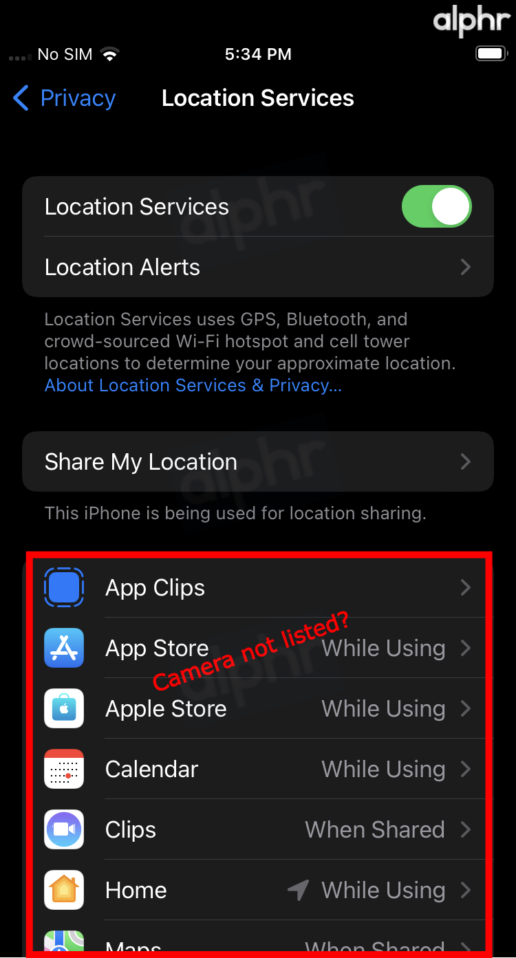 - In the “Location Services” menu, scroll and find “Camera.” If “Camera” is not listed, try resetting the app or launching it. It should prompt for location permission the first time it requests it, such as a fresh install or a particular update.