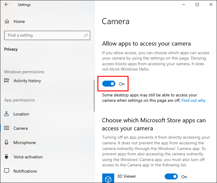 - Under the “App permissions” section, move the “Camera” toggle to “On.”