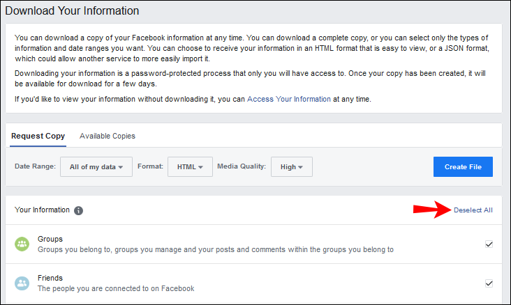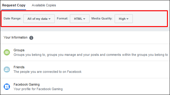 You can download all your messages from the moment you’ve created your Facebook account, or you can select the time you would like to save. When it comes to the format, your options are HTML and JSON. Quality ranges from high, medium, to low.
