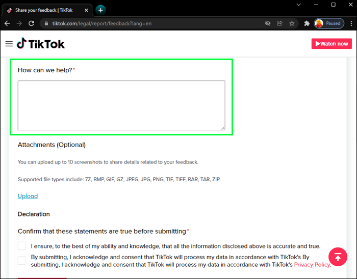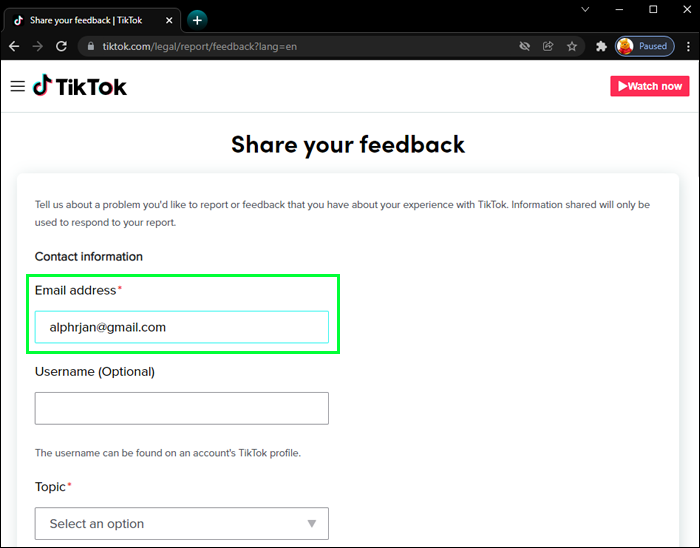 Follow these steps to recover your account using the TikTok feedback form via your PC: