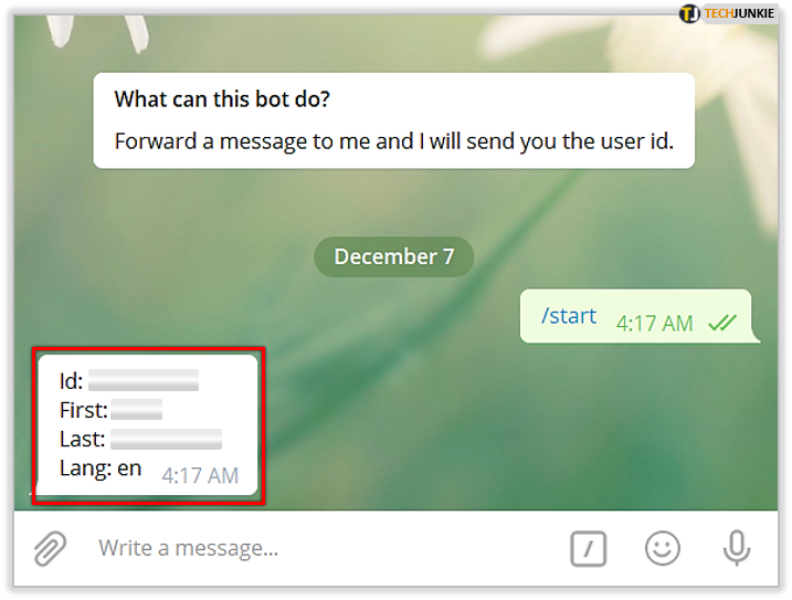 - By clicking Start, you’ve automatically entered “/start.” It will prompt the bot to display your user ID, as well as your selected first name, last name, and the language of choice.
