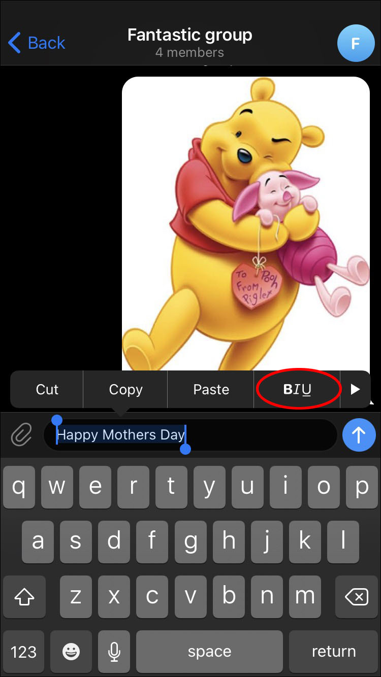 - Telegram’s formatting menu will automatically appear. Select BIU.