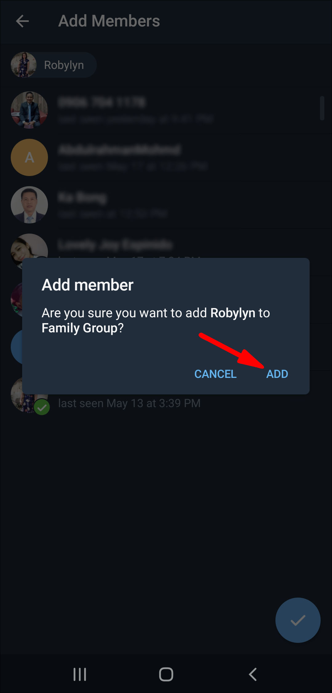 - Choose the person you want to add to the Telegram group and go to Add.
