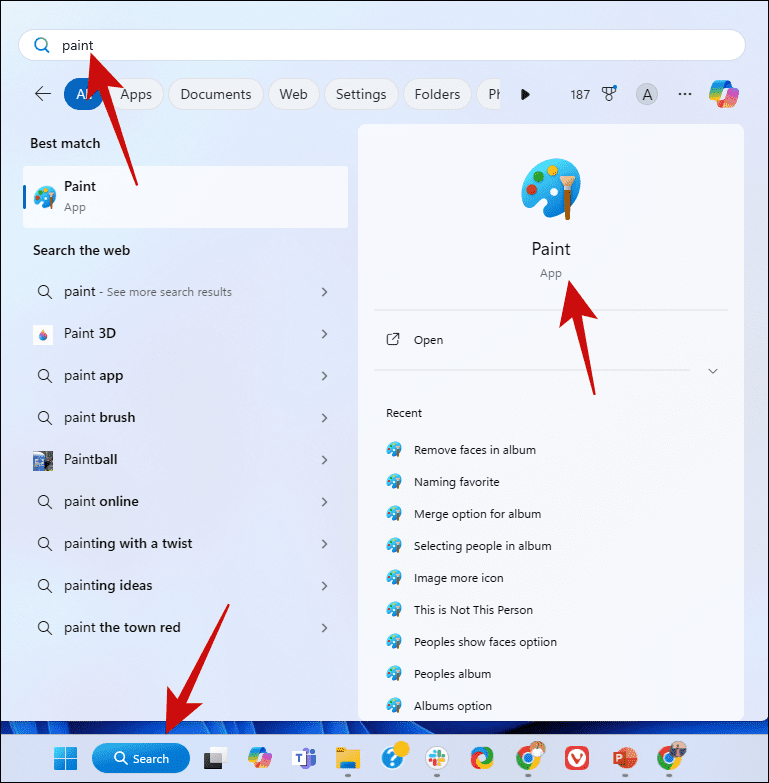 Step 1: Click the magnifying lens on the Taskbar, type Paint, and click on the Paint app.