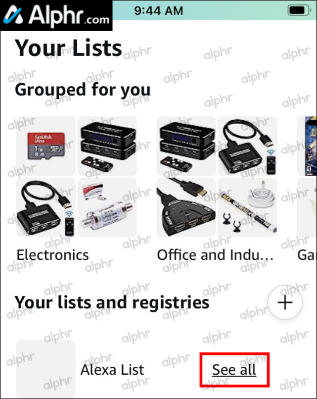 - Side-scroll through the “Your lists and registries” section until the end, then tap “See all.”