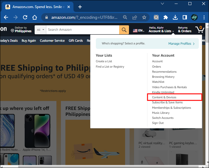 - Using the drop-down menu, select “Your Content and Devices.”