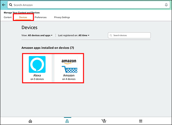 - Using the top menu, click on “Devices.” You’ll see a list of all devices logged in to your Amazon account and the date they were registered.