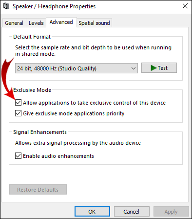 - Now, go to the Advanced tab and uncheck (or check) the box next to Allow applications to take exclusive control of this device.